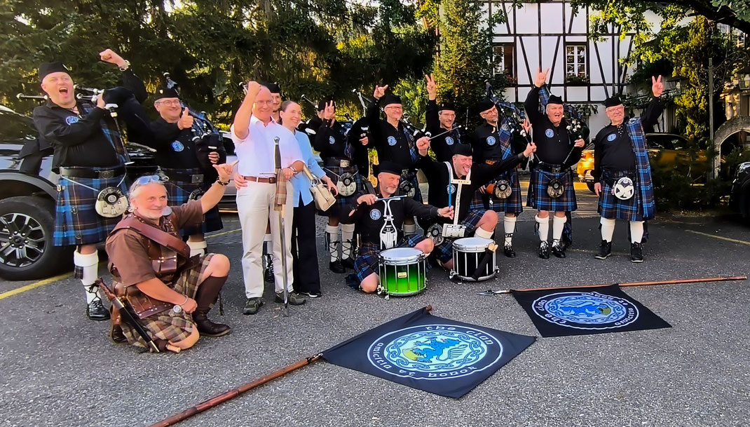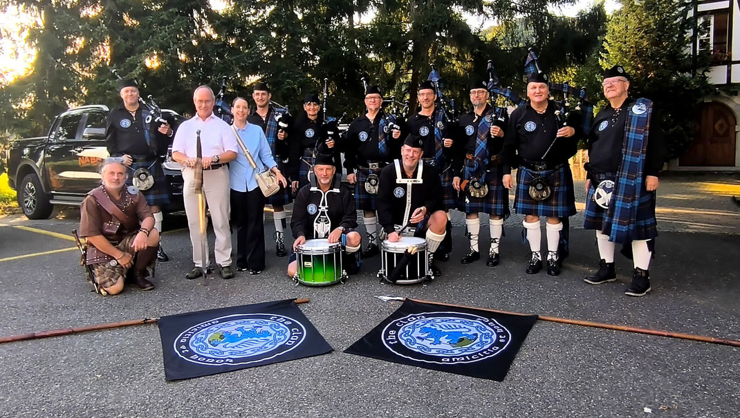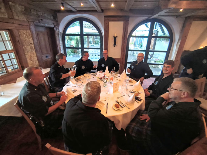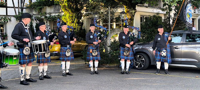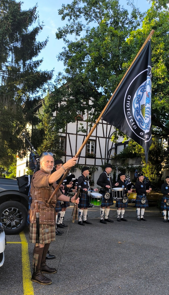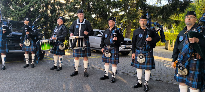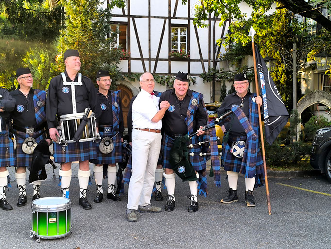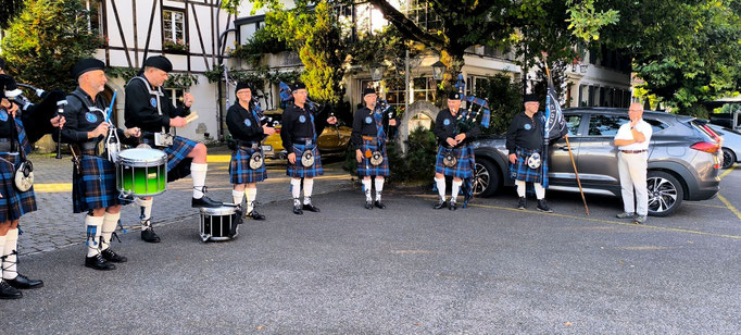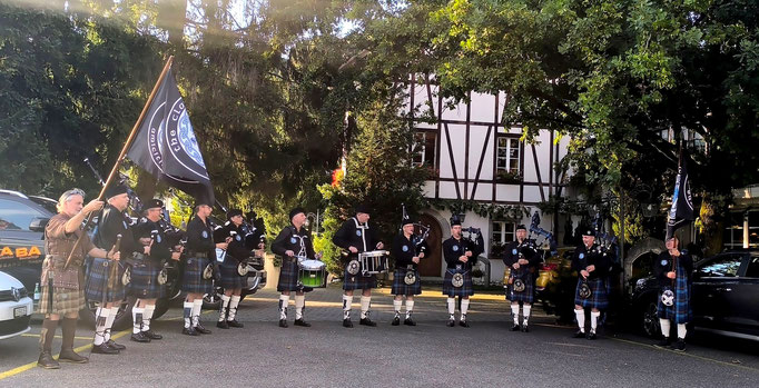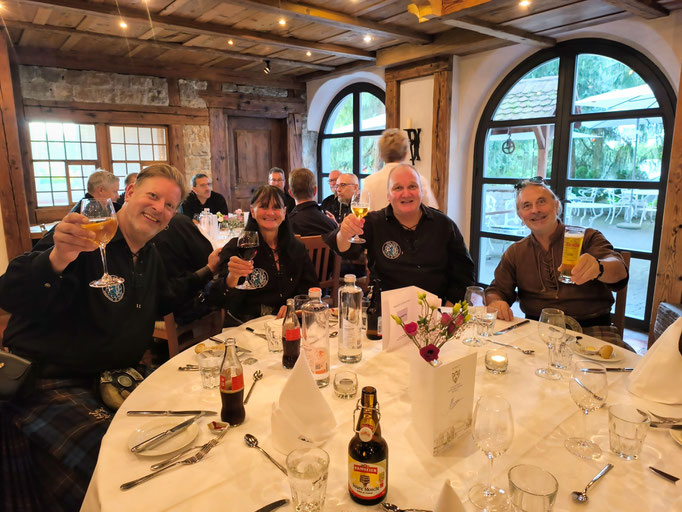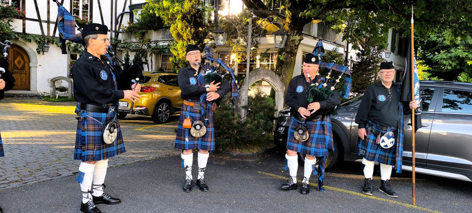 Zur Überraschung der Belegschaft (selbstverständlich auch mit dem Car unterwegs ;-) ), erwarteten wir sie bei der Ankunft zum Nachtessen im Landgasthof zu den drei Sternen in Brunegg AG mit einem schottischem Empfang mit Pipes and Drums. Gross war die Überraschung!